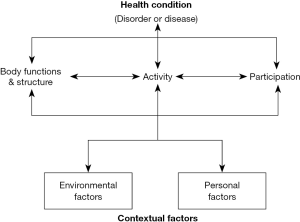 The concept of evaluating a patient’s functional capacity arose from a progressive understanding of the biopsychosocial model of health, in which diseases (or injuries) result, not only in derangements of normal bodily functions or structures, but also in limitation of the person’s day-to-day activities and restriction of the person’s participation in societal responsibilities (Figure 1) (16). Thus, the optimal care of such a person requires the measurement, evaluation and amelioration of these disease-associated activity limitation and participation restriction, in addition to the cure or amelioration of the underlying or primary physiological derangements (17).